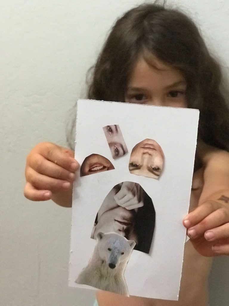 בסוף היום, כל השולחן שלי היה מלא גזירים וניירות, ואביגיל בת הכמעט-חמש הגיעה הביתה ומאוד התעניינה בכל הדברים האלה על השולחן. הסברתי לה שגזרתי אותם ליצירה, אז תוך שתי שניות היא כבר הייתה בפוזה הזאת-